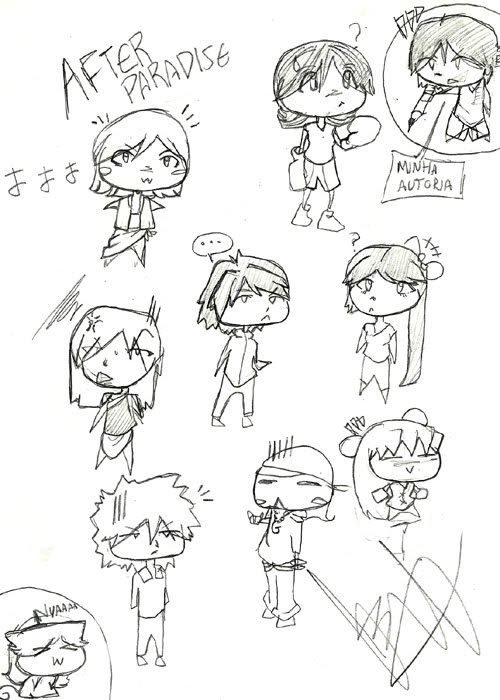 Aqui está o rascunho dos personagens chibis que eu fiz..